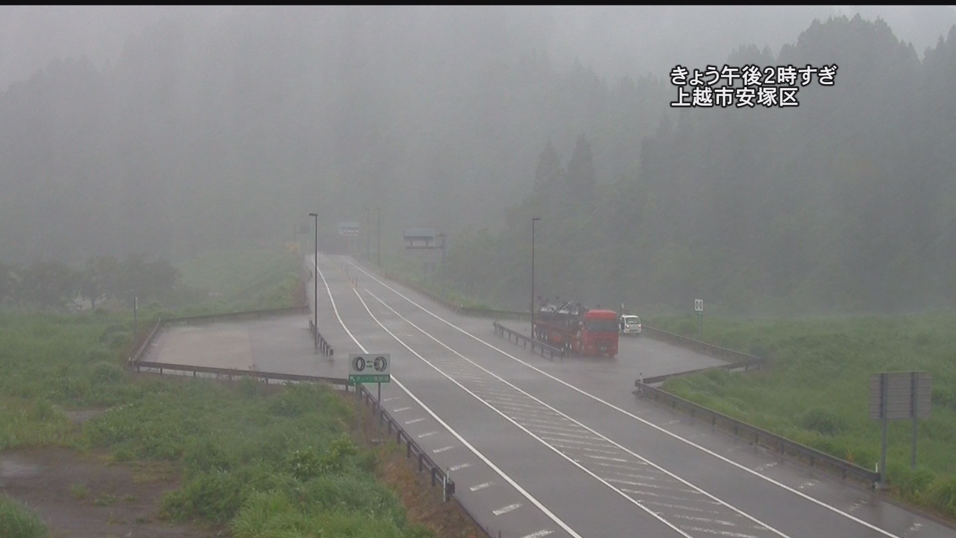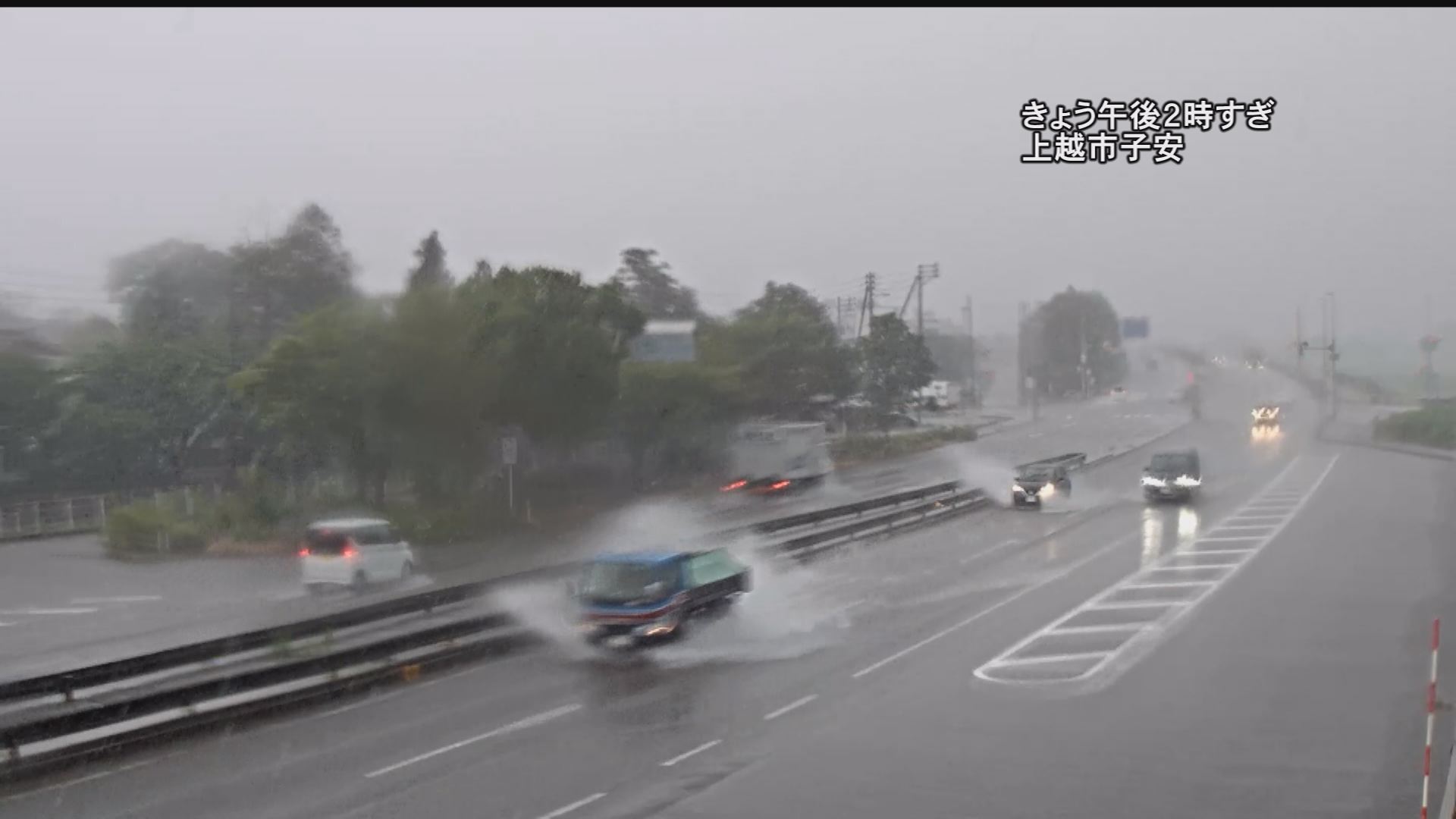 午後2時過ぎの国道18号線バイパス子安付近の映像です。車が激しく水しぶきをあげている様子が分かります。高田では午後2時までの1時間に16.5ミリ、安塚では午後3時までの1時間に22ミリの強い雨を観測しました。