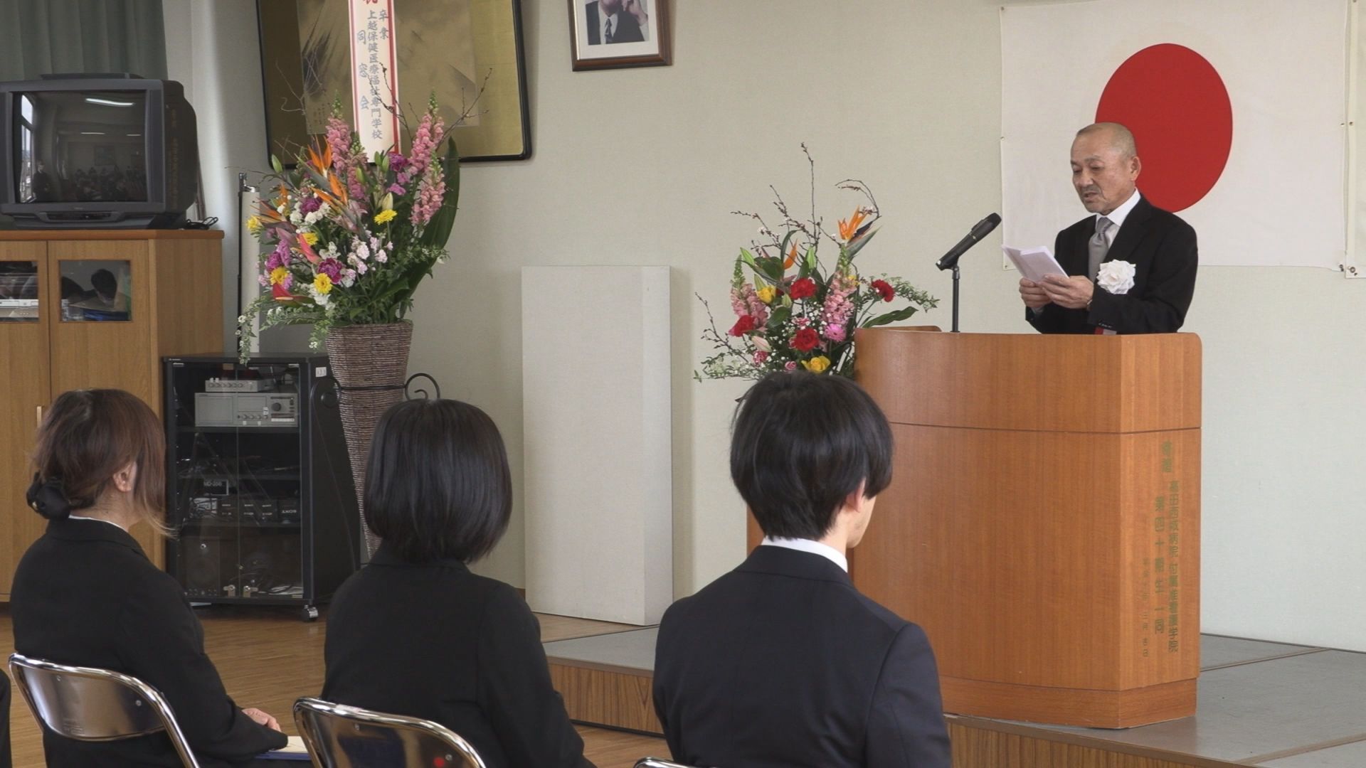 上越市西城町1丁目にある上越保健医療福祉専門学校の卒業式が7日(木)に高田西城病院で行われ、介護福祉士を目指す9人が学び舎を後にしました。一方、学校では来年度学生の募集を停止し、かわって学校とは別の団体が校舎を利用して介護人材を養成する講座を開くことにしています。