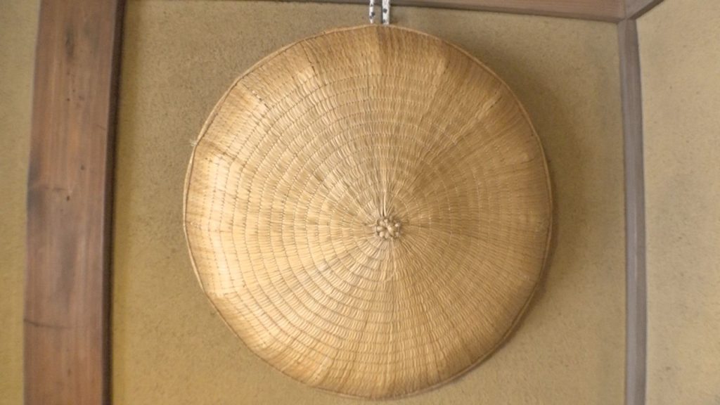 上の写真は高田瞽女が実際に使った褄折笠です。 能生谷の特産品で、ネマガリダケとスゲで編んでいます。