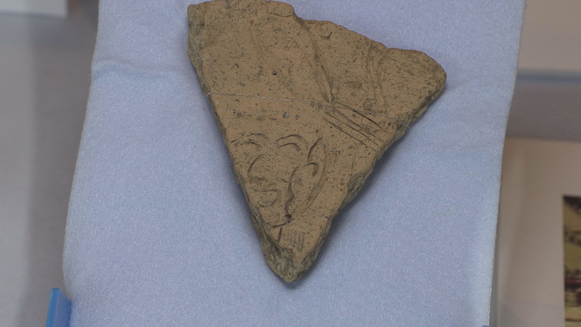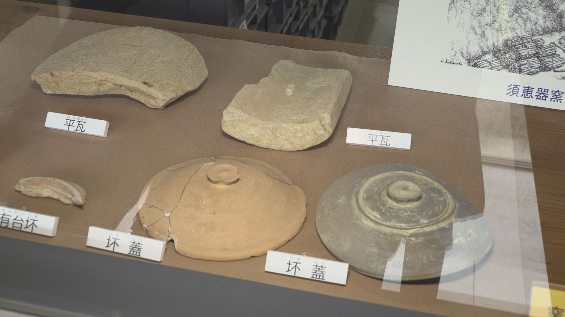 会場にはこの遺跡から20年~40年ほど前に発掘された食器や瓦など約100点が展示されています。