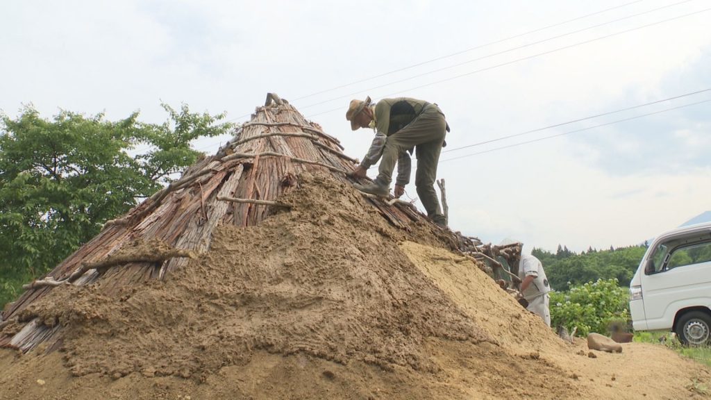 続いて水を含ませた土をかぶせていきます。屋根はこれまでかやぶきが主流とされていましたが、30年ほど前の調査や研究で、土をかぶせていたことが明らかになっています。「縄文学校」によりますと、この方法で復元されるのは、県内で初めてだということです。