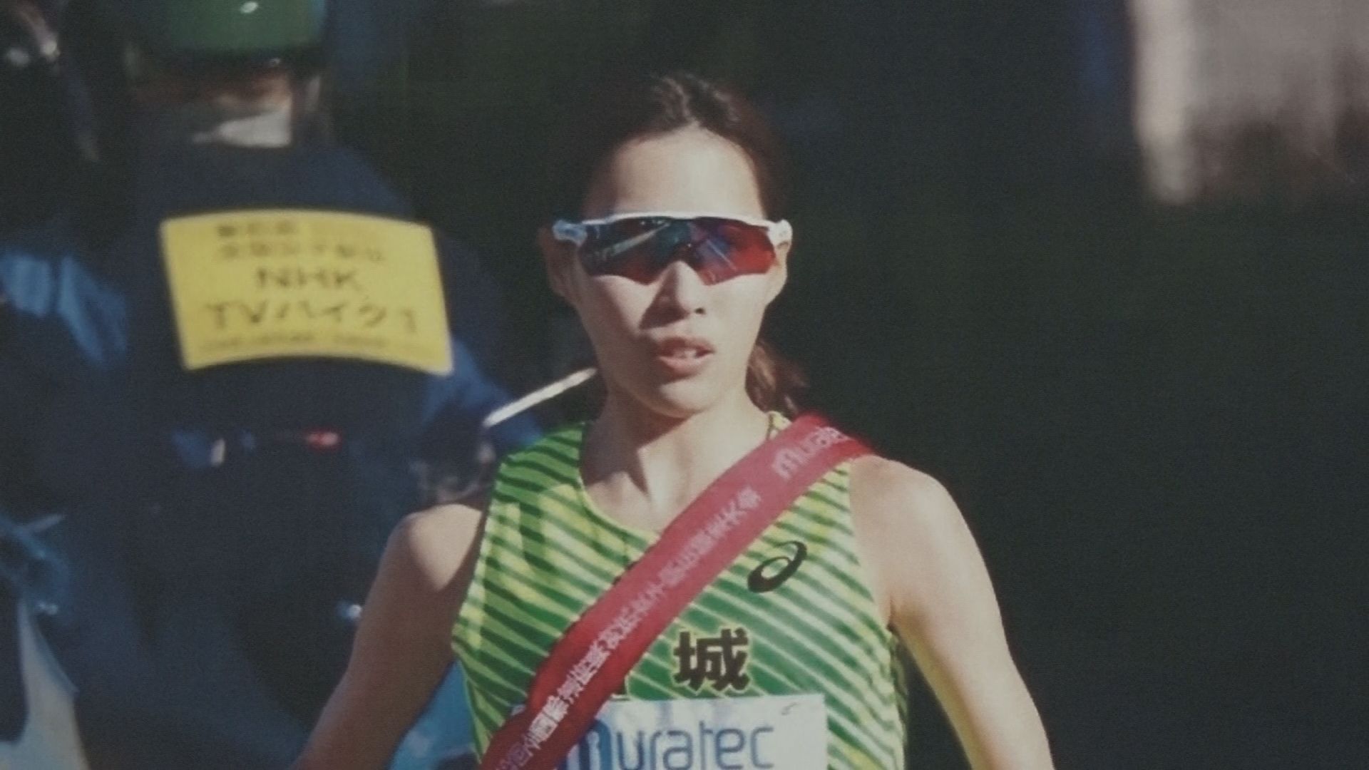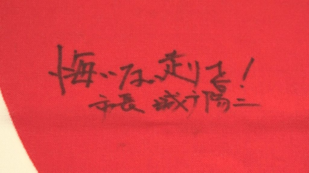 国旗にはテレビ局のスポーツテーマ曲「舞台に立って」の歌詞から「自分を超えて行け‼」と言葉が添えられています。
