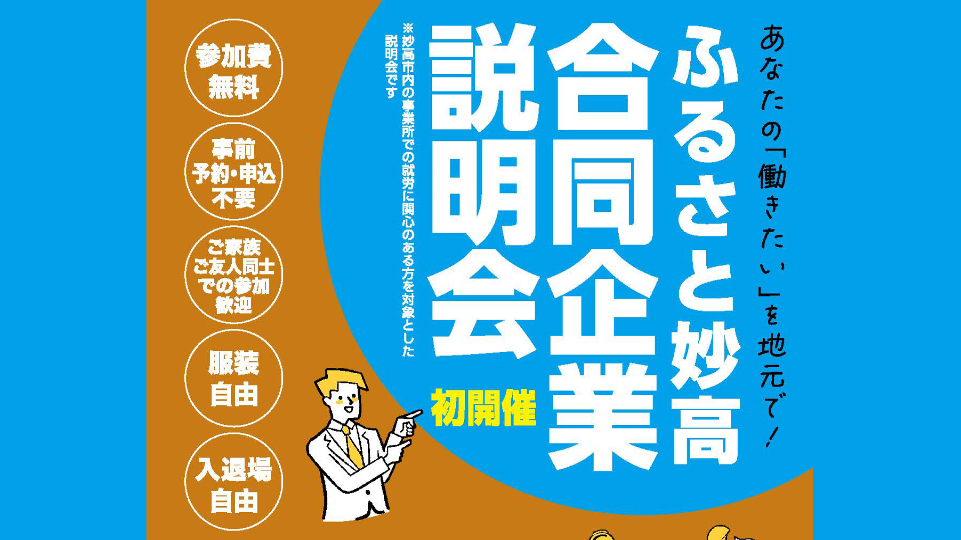 妙高市の企業20社を集まる「ふるさと妙高 合同企業説明会」が10月12日(土)、新井ふれあい会館で開催されます。対象は妙高市で働きたい人やその家族、将来妙高市で働きたいと考えている人などです。