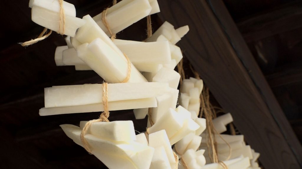 はじめにダイコン50本の皮をむき、長さ15センチ厚さ2センチほどに短冊切りし、束にして麻縄で縛りました。