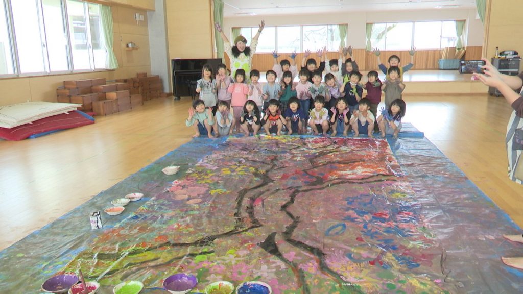 巨大な紙に手形や足形などを付けるアート作品づくりに、妙高市立新井あおぞら保育園の年長児が挑戦しました。作品づくりには、市内在住の壁画アーティストが加わったということで、どんな作品が完成したのでしょうか?