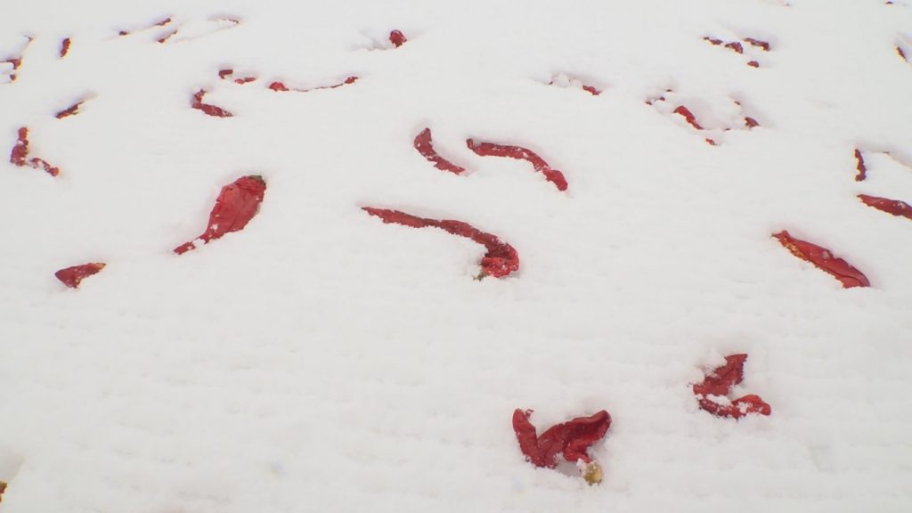 「雪さらしのはじまりは、昔、軒先にあったトウガラシがたまたま雪の中に埋まってしまった。春になって出てきたトウガラシを食べたらアクがとれてまろやかな辛みになっておいしくなってたことから翌年から雪さらしを試し始めた」
