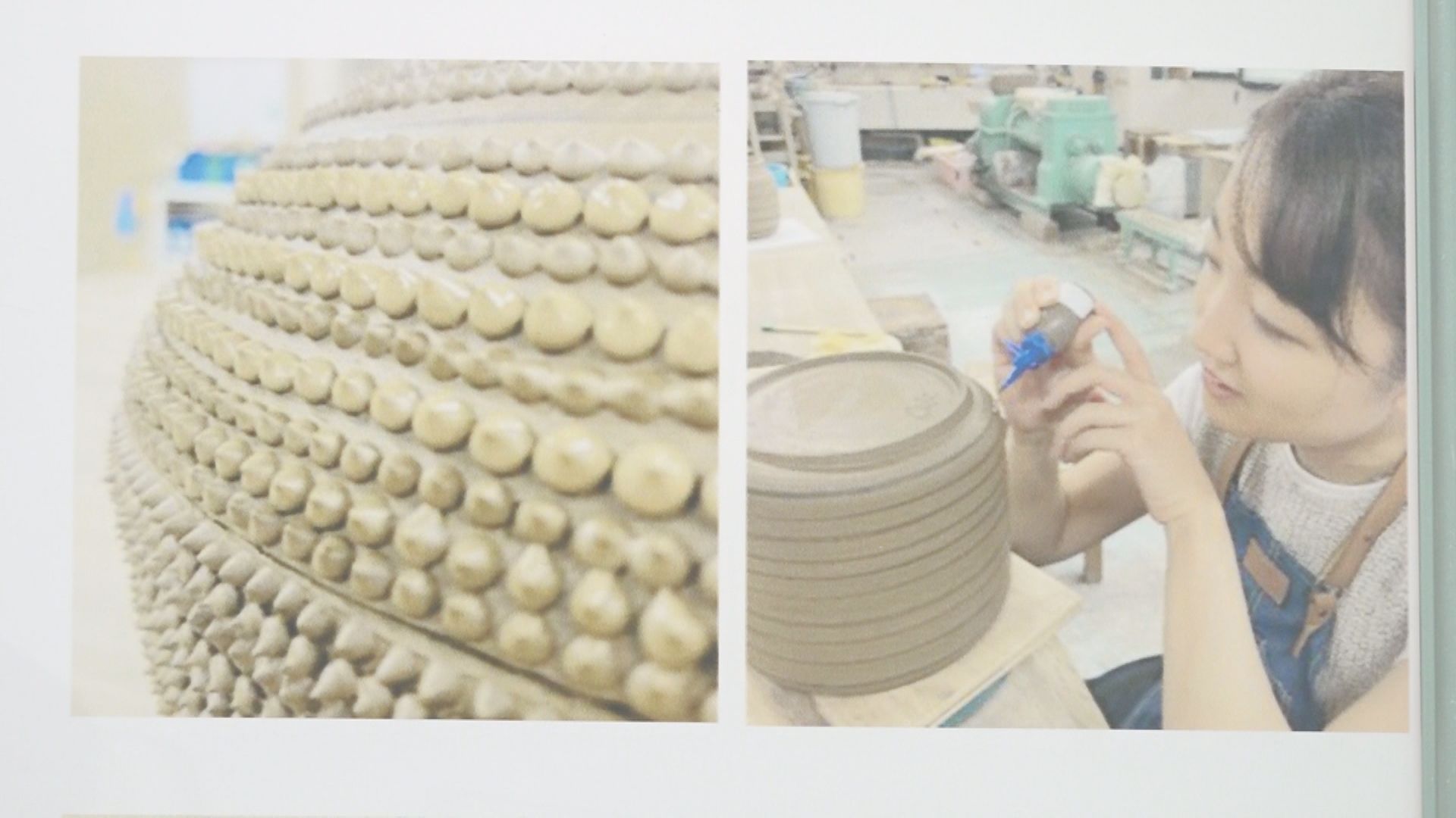 これは、柏崎市出身の小学校教諭、阿部郁美さんの陶芸「天雫」です。赤土で作った箱です。大地にしずくが落ちる「波紋」をイメージしました。