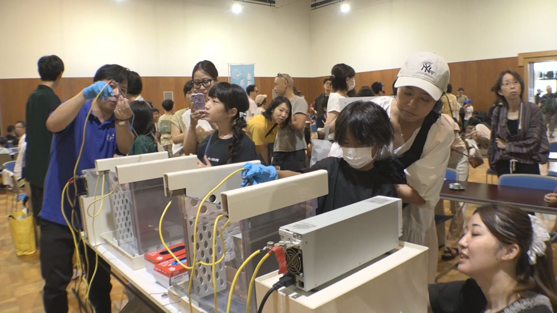 ここではチタンを使った定規などを作ります。 チタンは電気を流すと色が変わる性質があります。参加者はこの性質を利用し水の入った水槽の中にチタンを入れ、そのあと電気を流しました。