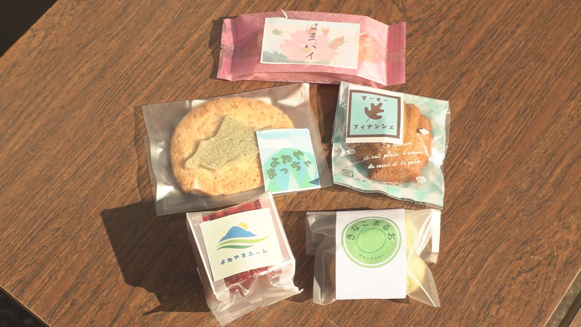 5種類あり、米山をかたどったアーモンドサブレ「よねやまっちゃ」や「よねやまふぃん」、柿崎産のきな粉を使ったクッキー「きなこまるお」など、どれも柿崎をイメージしています。生徒たちは使う材料や味について意見を出し合い、商品名やパッケージも考えました。