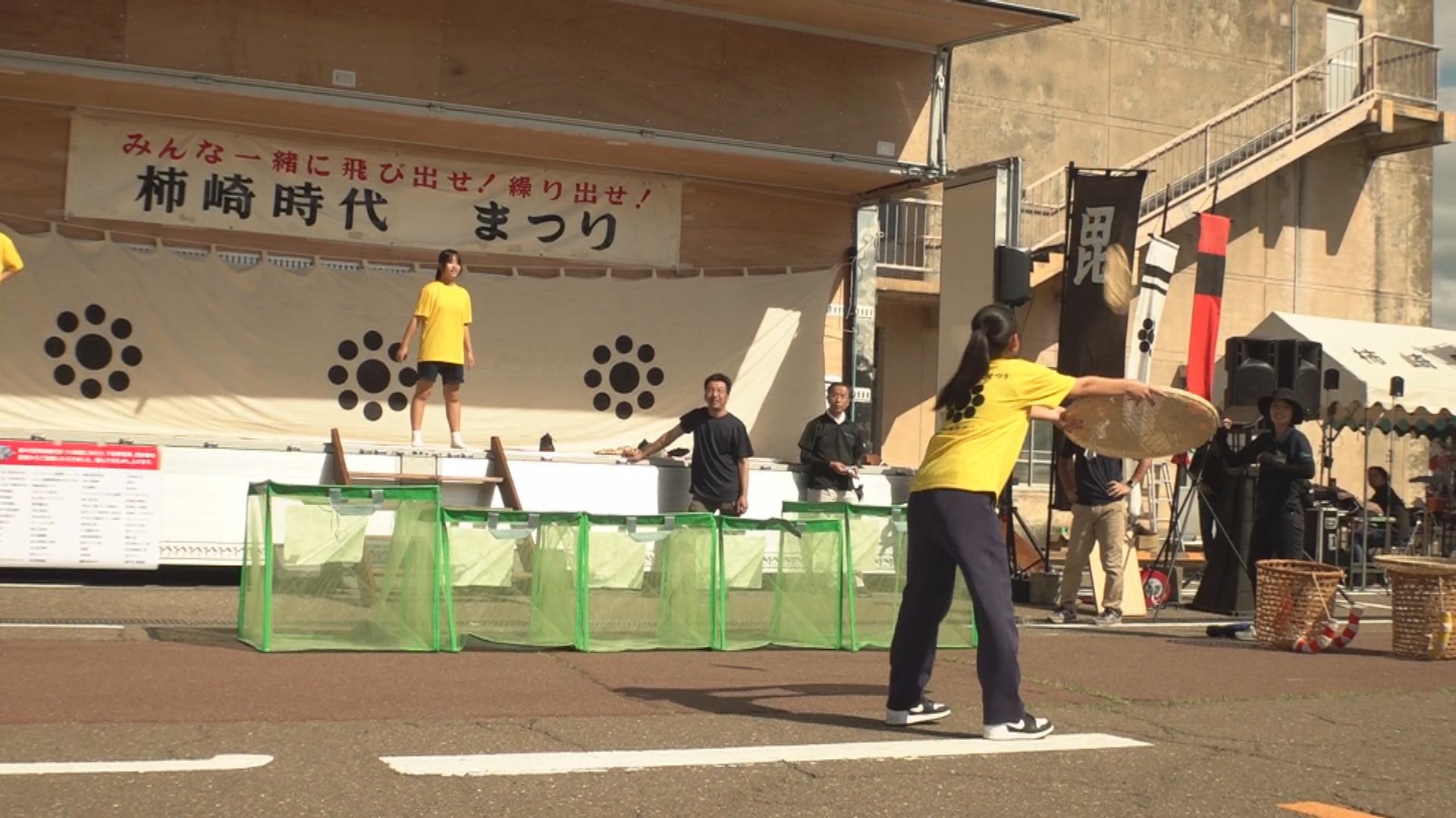 上越市柿崎区ゆかりの戦国武将、柿崎景家をたたえる夏の恒例イベント「柿崎時代まつり」が、27日(土)に開かれました。開催は毎年8月上旬でしたが、暑さ対策で初めて時期をずらしました。これに合わせ、恒例の水鉄砲合戦がなくなり、代わりにわらじ飛ばしが行われました。また柿崎中学校の生徒が地元の菓子店と協力して作ったクッキーなどを販売し、多くの人でにぎわいました。