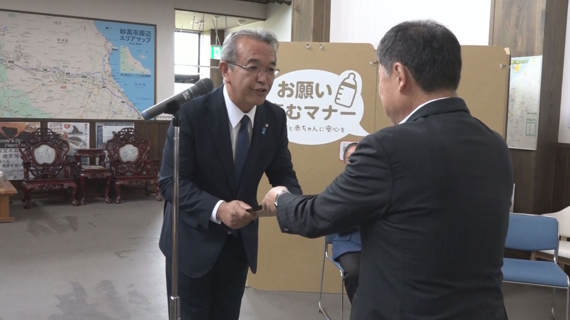 9月30日は贈呈式が行われ、全国の道路舗装会社で組織する日本道路建設業協会の堀吉伸 北陸支部長が、妙高市の城戸市長に目録を手渡しました。