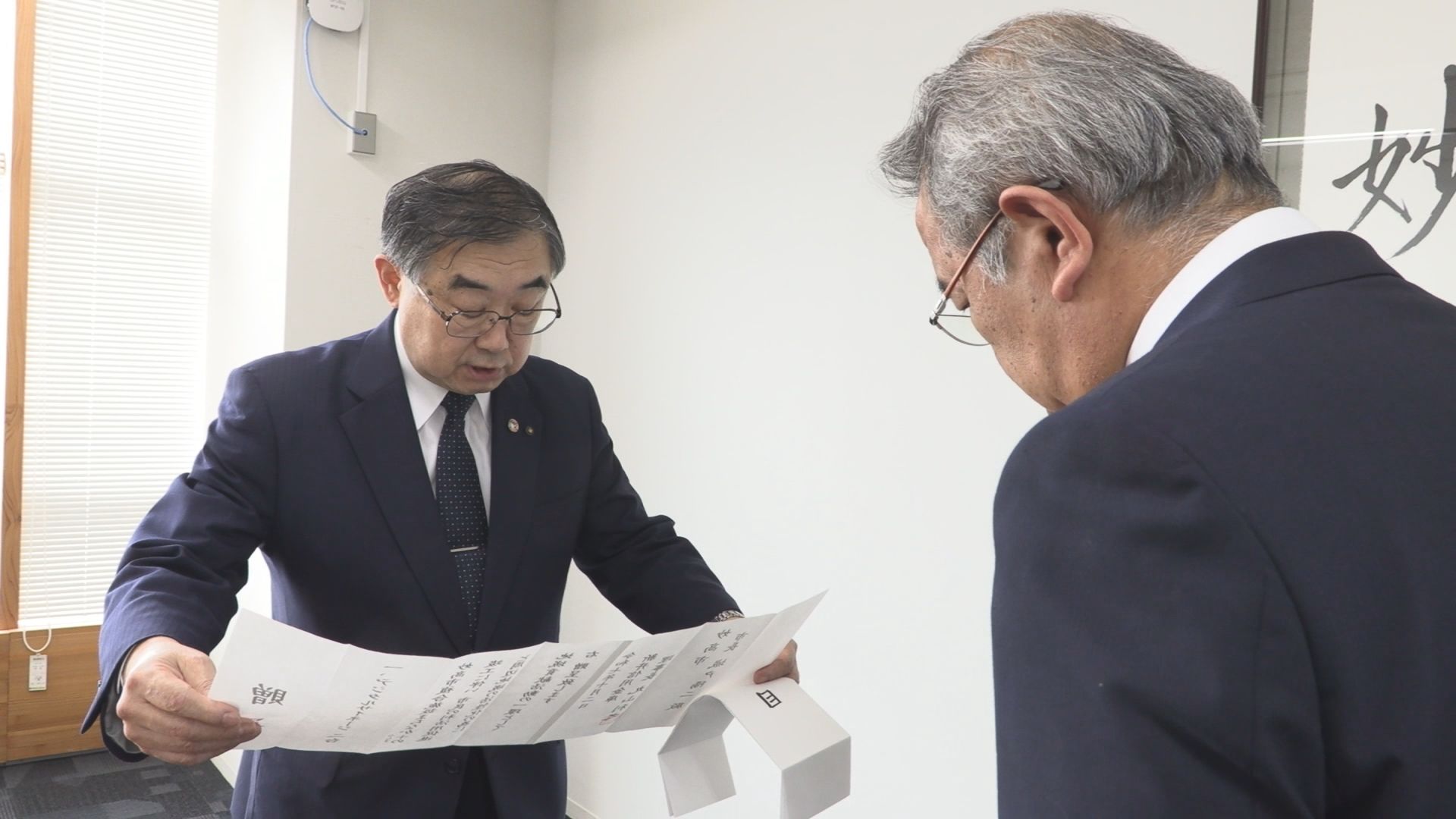 寄付されたのは、55インチのデジタルサイネージ2台です。2日、新井信用金庫の丸山利之理事長が妙高市役所を訪れ、城戸陽二市長に目録を手渡しました。