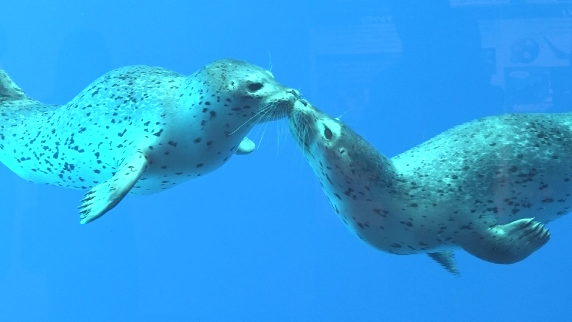 2階のふれんどプールでは、うみがたりで生まれた1歳のゴマフアザラシ「ミツバ」と2歳の「フタバ」によるショーが行われています。