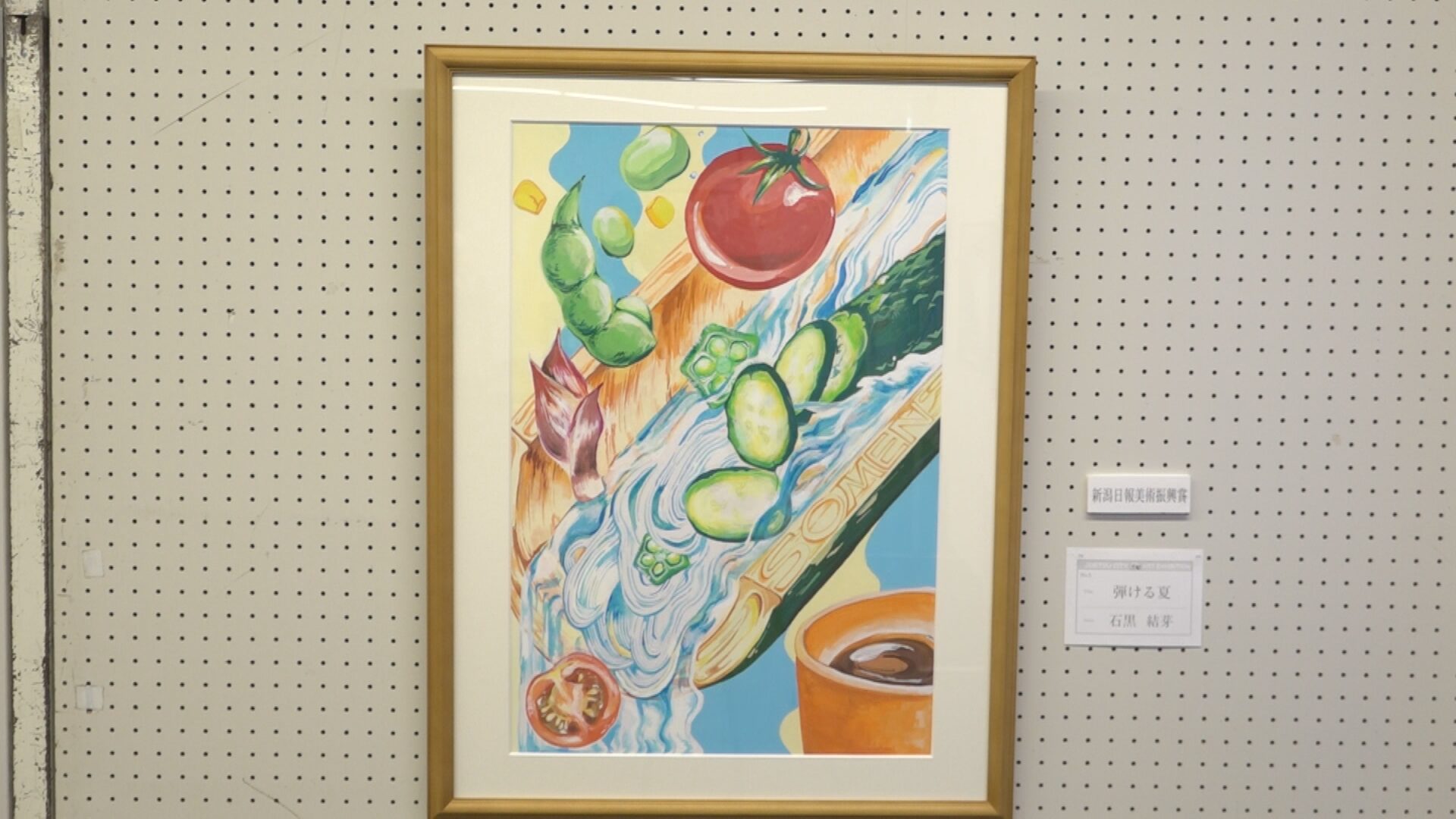 これは工芸・グラフィックデザイン部門で新潟日報美術振興賞を受賞した石黒結芽さんの作品「弾ける夏」です。