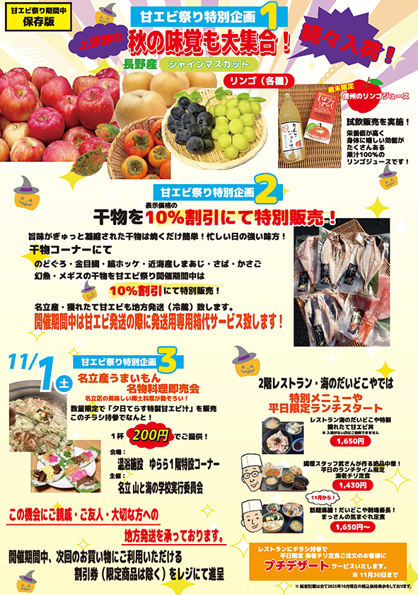 ■内容:甘エビ即売会(朝どれ直送)、甘エビアレンジメニュー勢ぞろい(刺身、甘エビ唐揚げ、ユッケ丼、甘エビ丼など)