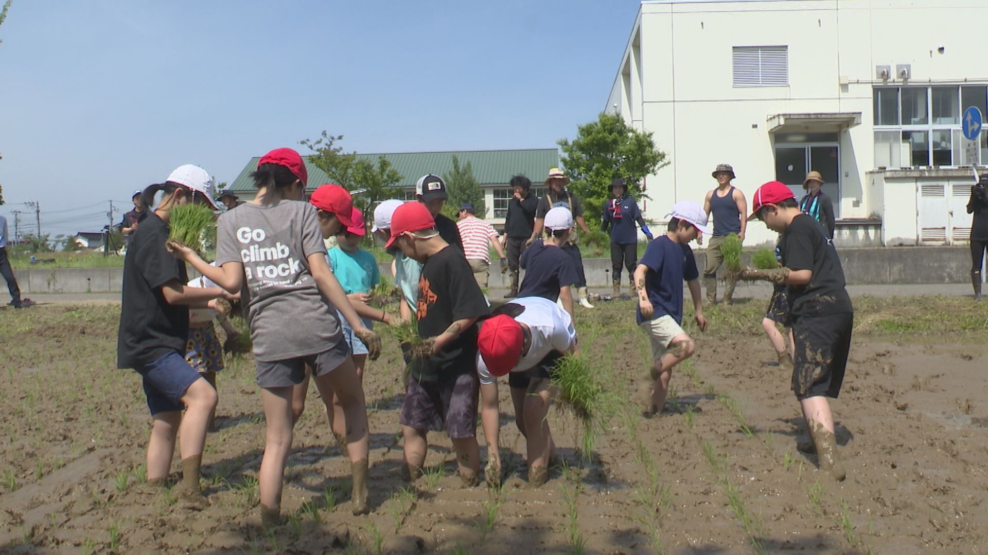 コメづくりをしたのは明治小学校の5年生12人です。4月にコシヒカリの種を苗箱にまいて育てたあと、5月に学校の隣にある田んぼ3アールに手で植えました。