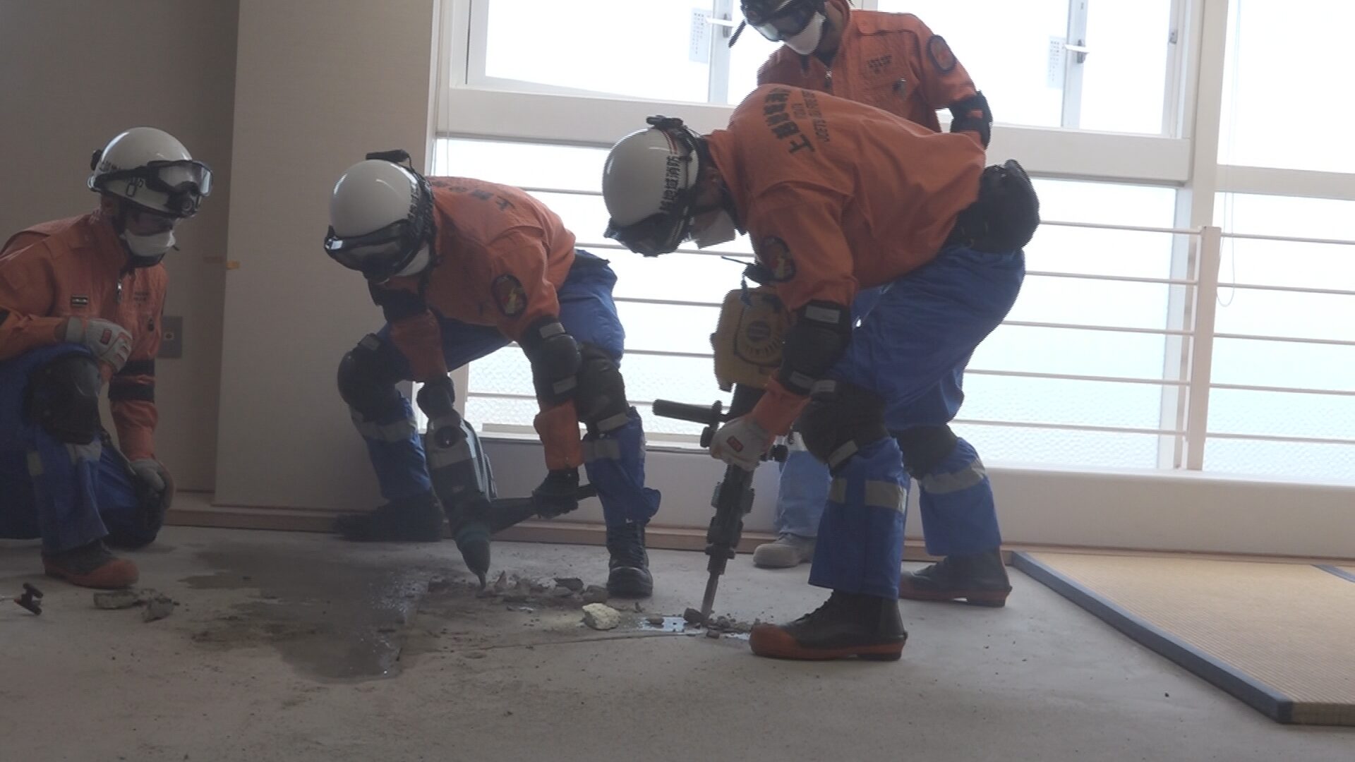これは鉄筋コンクリートの床に穴をあけて下の階に閉じ込められた人を救出する訓練です。災害現場ではさまざまな救出シーンが想定されるため、実際の建物を利用した実践的な訓練が欠かせません。