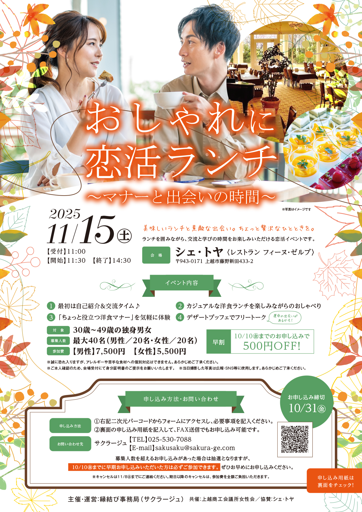 上越市の結婚相談所サクラージュと上越市商工会議所女性会の共催で、ランチを囲みながら素敵な出会いが楽しめる恋活イベント「おしゃれに恋活ランチ~マナーと出会いの時間~」が11月15日(土)に行われます。男性、女性ともに現在参加者を募集しています。10月15日(水)までに申し込むと、参加費が500円引きとなります。