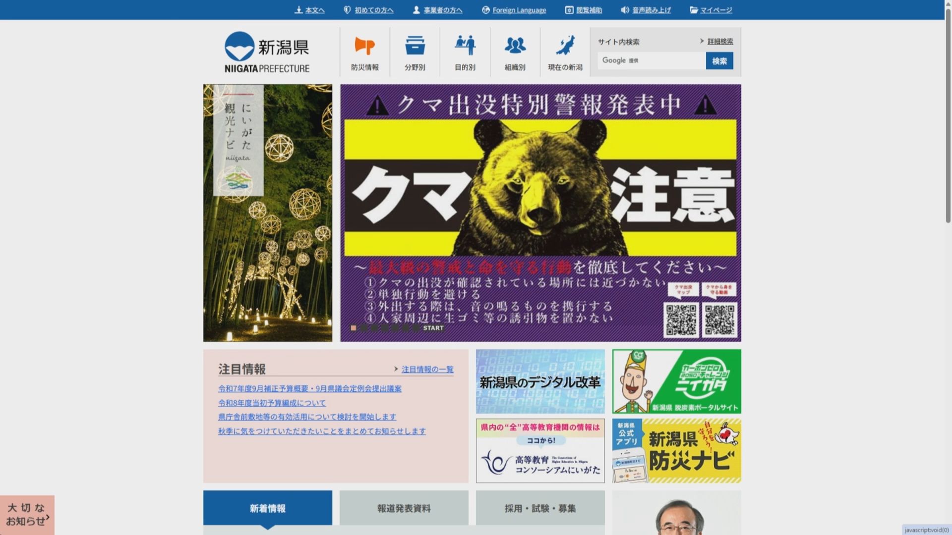 新潟県によりますと、今年県内で9月までにクマが出没した件数は1232件で、このうち人身被害は9件といずれも過去最多です。県では行楽シーズンを迎え、山に出かける人が増えることから、10月6日に「クマ出没特別警報」を発表し、注意を呼びかけています。