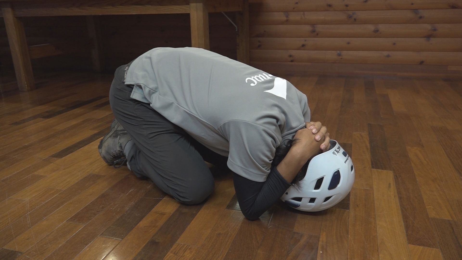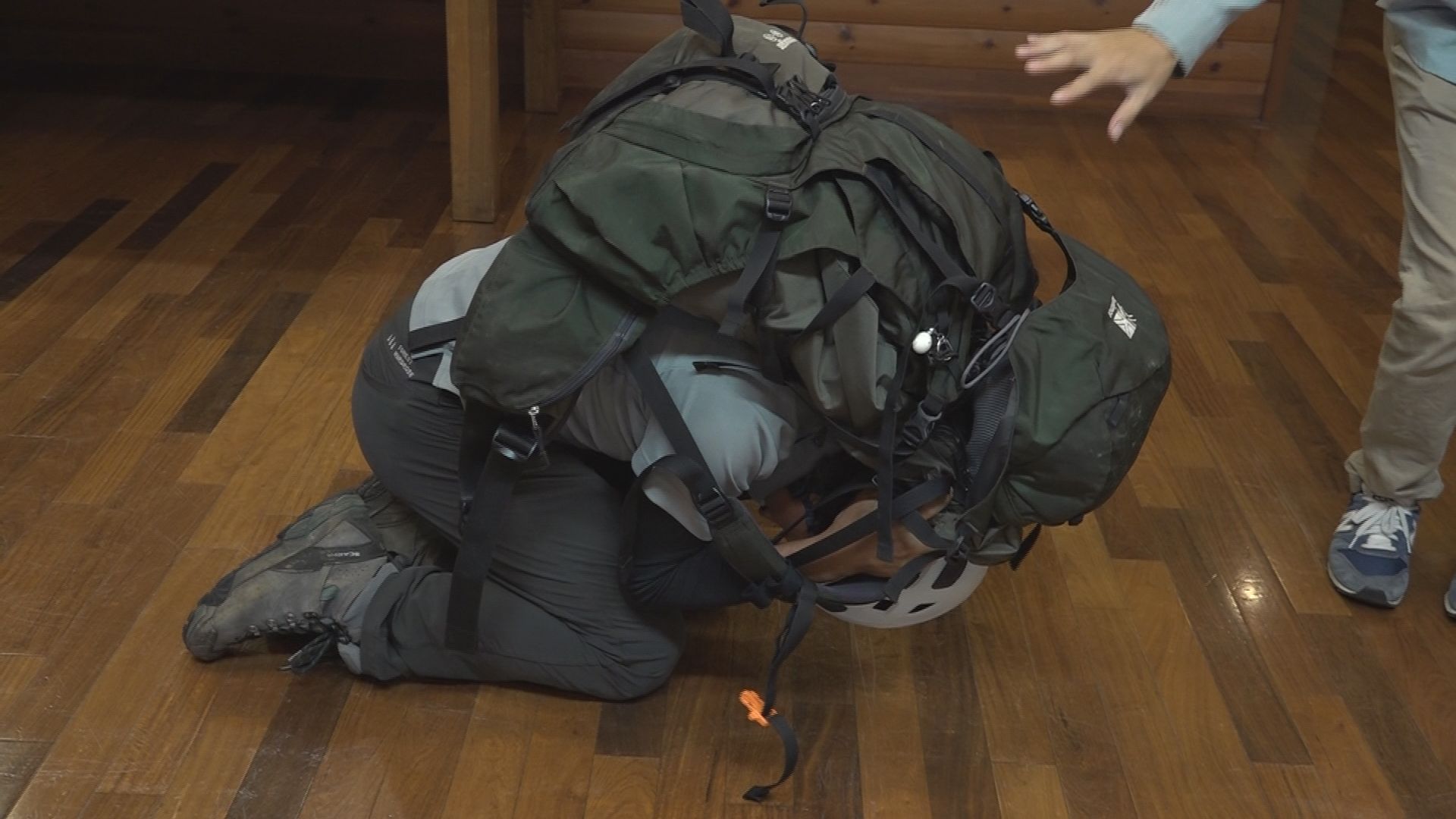 地面に伏せた時、リュックなどで頭や首を守るのも効果的です。