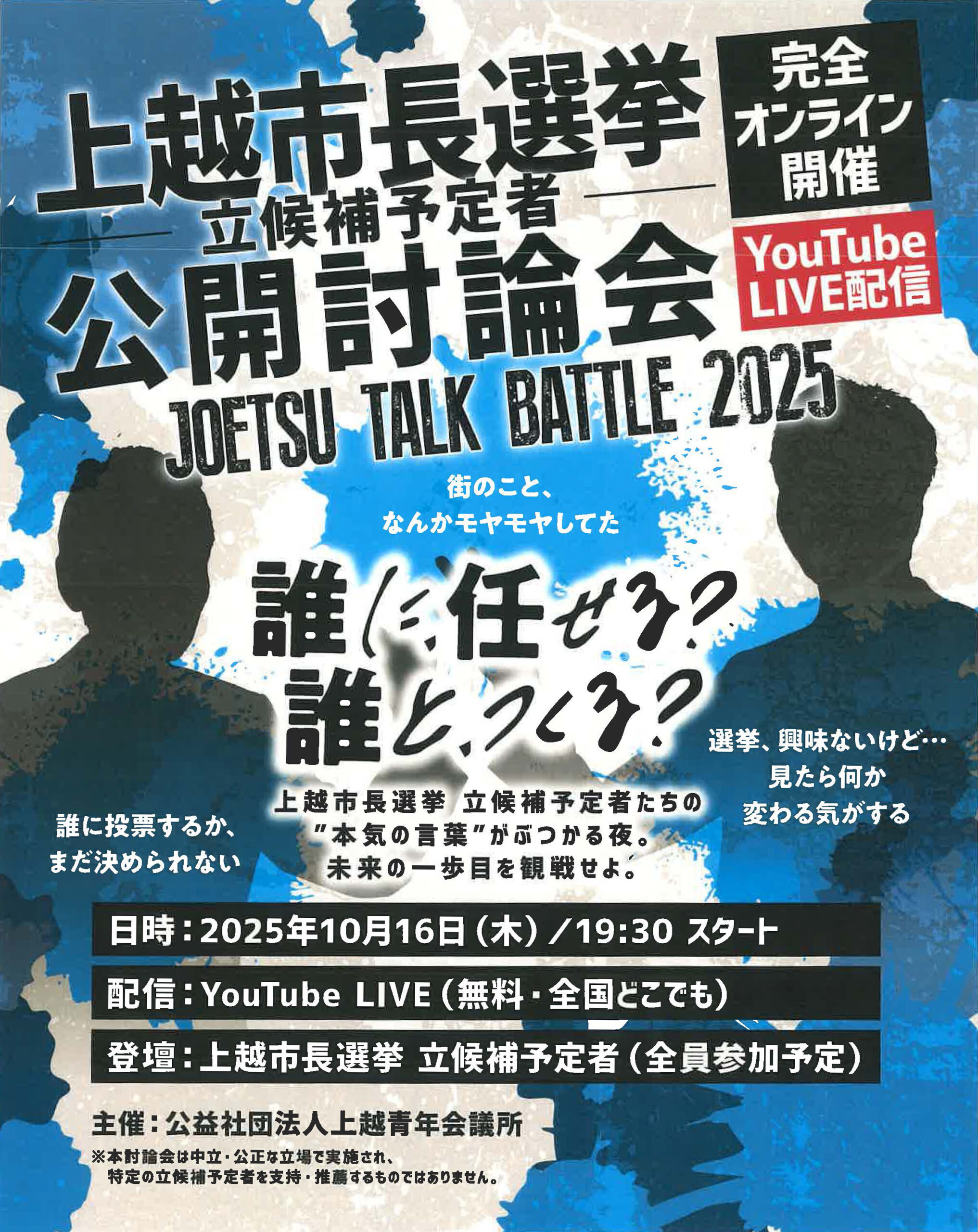 10月26日(日)に投開票が行われる上越市長選挙の立候補予定者による公開討論会があす10月16日(木)に、上越市市民プラザで開催されます。主催の上越青年会議所のYouTubeチャンネルで配信されるほか、JCV123chでも放送します。