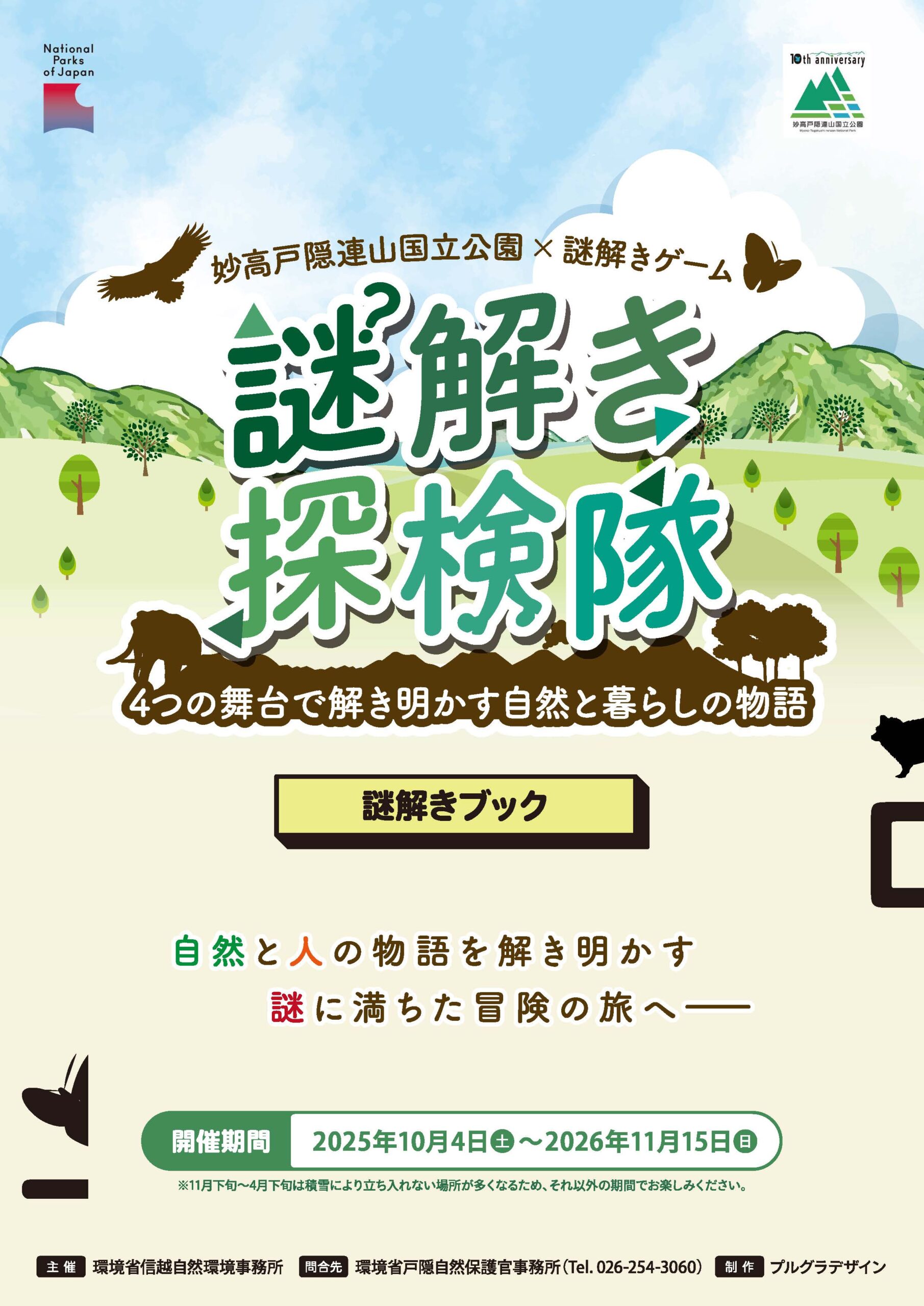 誕生10周年を迎えた妙高戸隠連山国立公園で、地域独自の自然と文化を体感しながら謎解きを楽しむイベント「妙高戸隠連山国立公園×謎解きゲーム 謎解き探検隊~4つの舞台で解き明かす自然と暮らしの物語~」が10月4日から行われています。