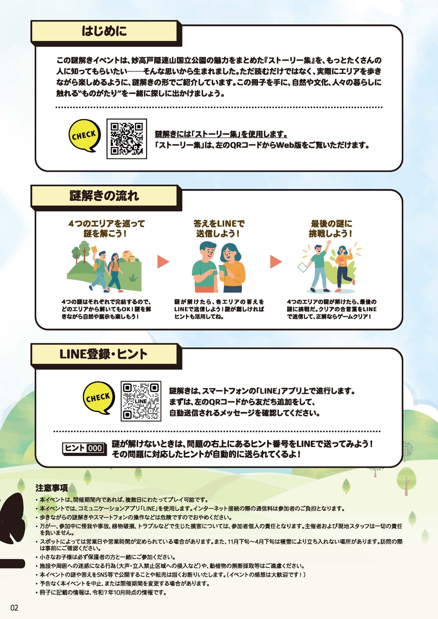 妙高戸隠連山国立公園では、地域独自の自然と文化のつながりを利用者にわかりやすく伝える「妙高戸隠連山国立公園ストーリー集 一目五山の風景が語る“ものがたり”」を、令和6年度に作成しました。今回、このストーリー集を多くの人に知ってもらおうと、特にこれまで国立公園との接点が少なかった若年層をメインターゲットに、「謎解き」という形でイベントを企画しました。