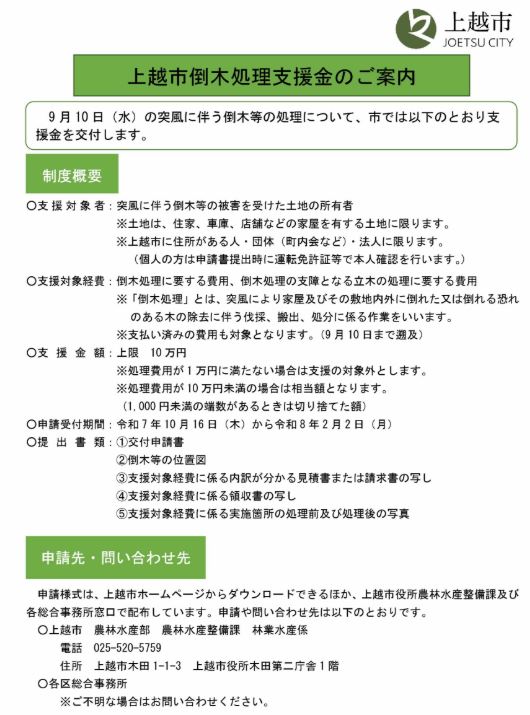 上越市は9月10日(水)に発生した突風に伴い、市内で倒れた木などの処理に対し支援金を交付します。