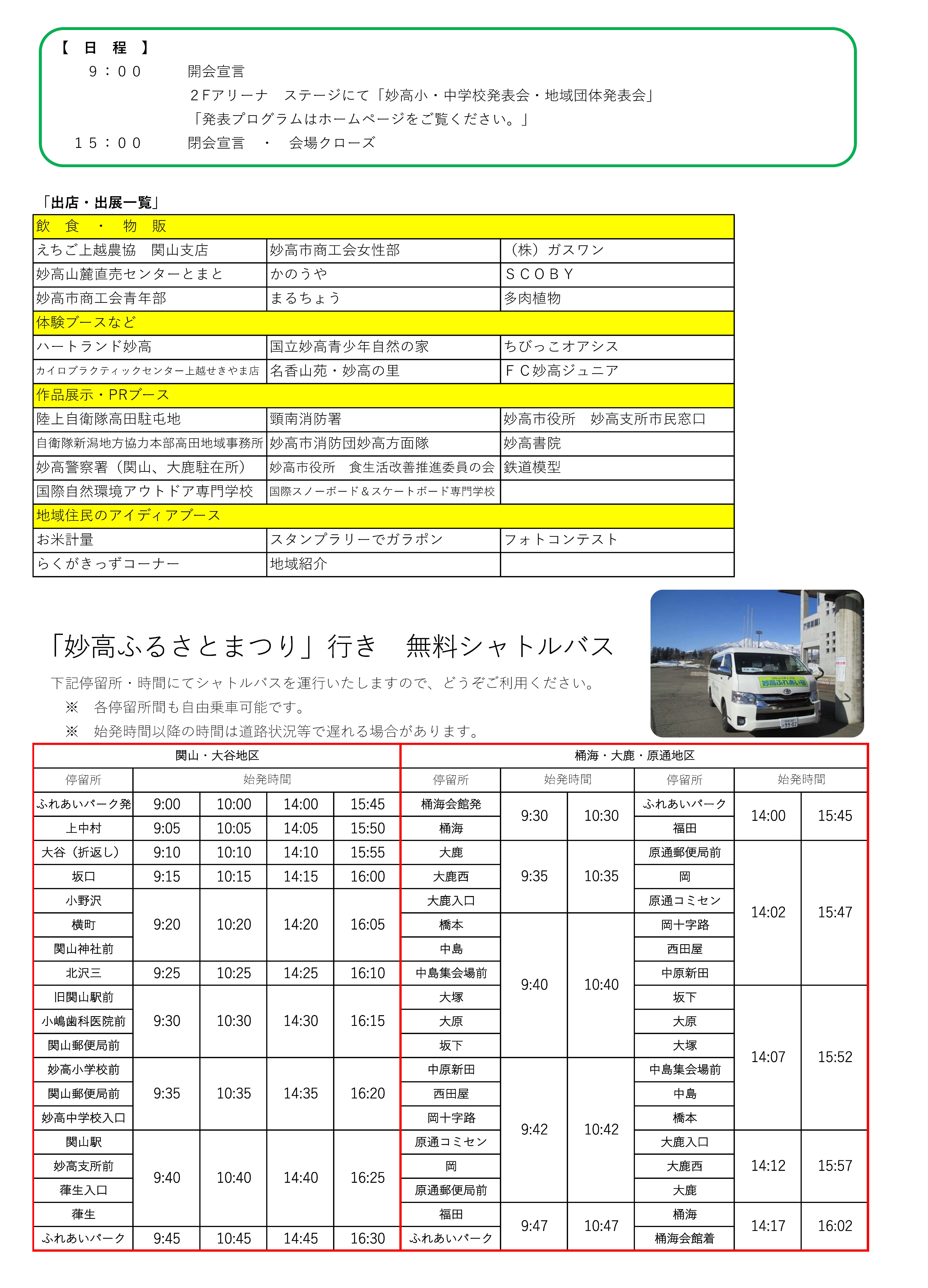 妙高ふるさとまつりは「妙高地区の人と自然の恵みを生かした、これからの地域力の見直し」をテーマに、 毎年開催されています。