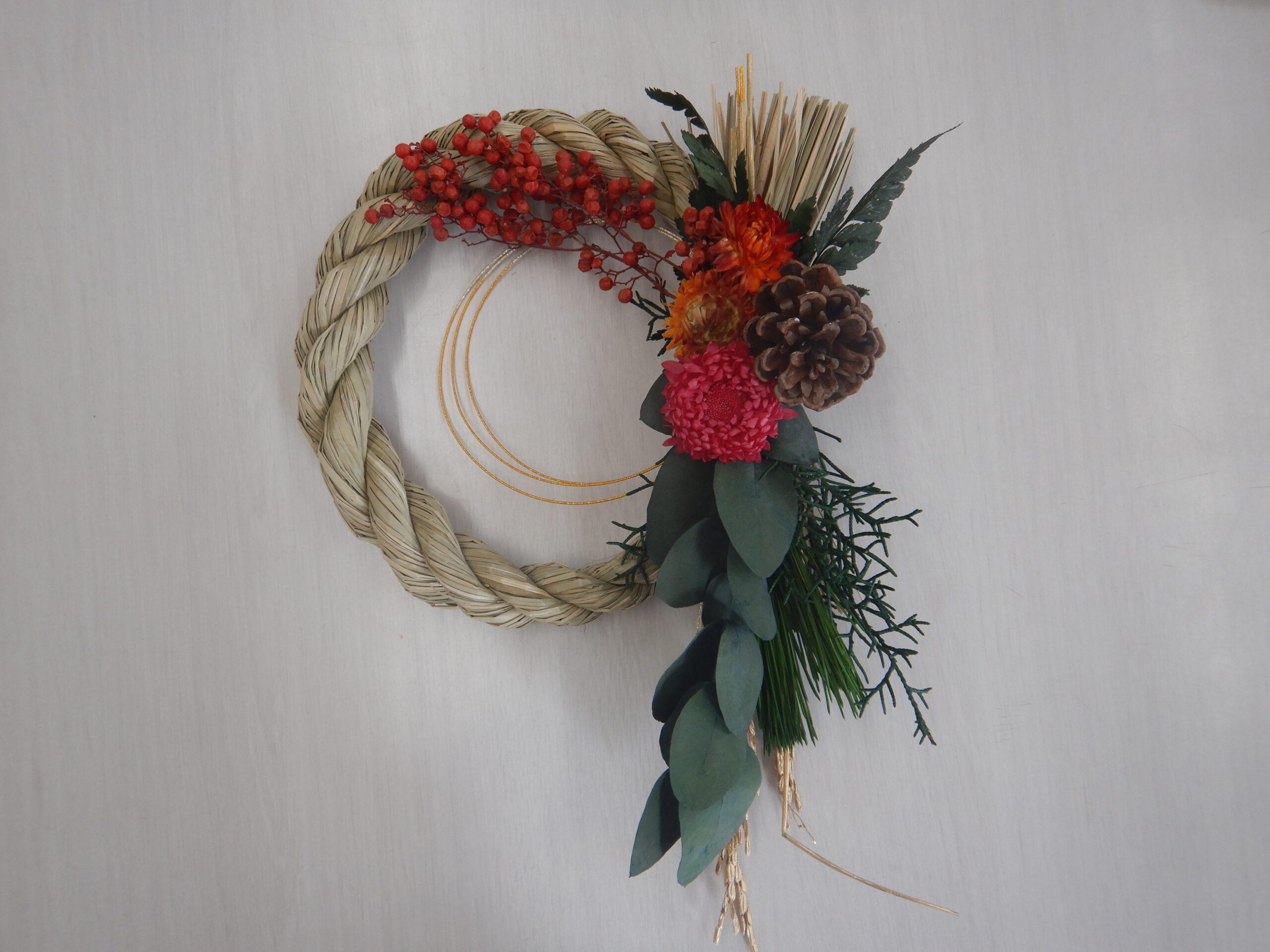 ワイヤーとグルーガンを使って作業をするので、汚れが気になる方は軍手かゴム手袋とエプロンをお持ちください。使いたい材料があれば持ち込みも可能です。ただし、その分の値引きはしませんのでご了承ください。しめ縄リースを持ち帰るための袋もお持ちください。