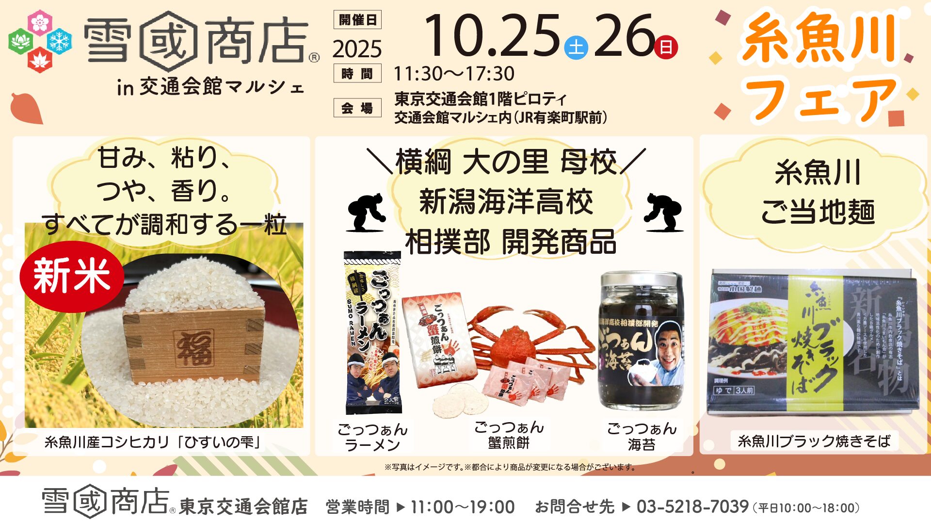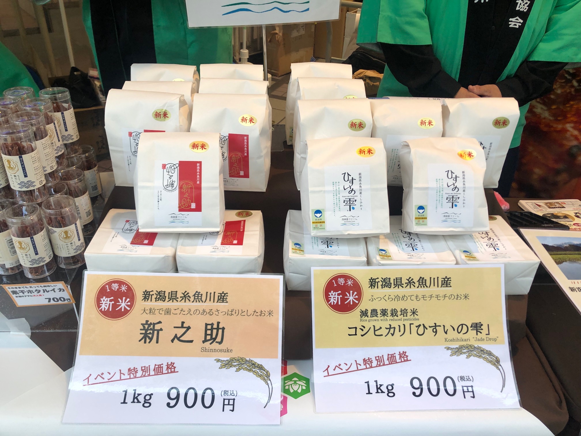 新潟県上越地域、雪国の特産品を販売している東京交通会館1階の「雪國商店」が、10月25日(土)と26日(日)の2日間、JR有楽町駅前で開催される「東京交通会館マルシェ」に出店します。今回は糸魚川市の新米や特産品を販売するフェアを特別開催します。