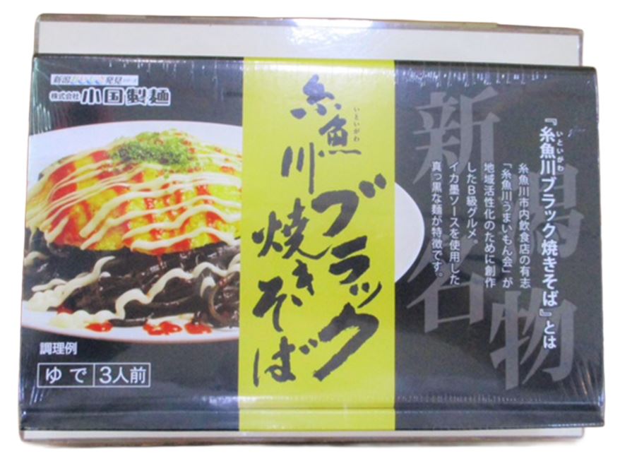 イカスミソースを使った、真っ黒な見た目がインパクト大のご当地麺です。お店によって味や具材が異なりますが、焼きそばの上に薄焼き卵をのせ、マヨネーズとケチャップをかけるのが定番です。