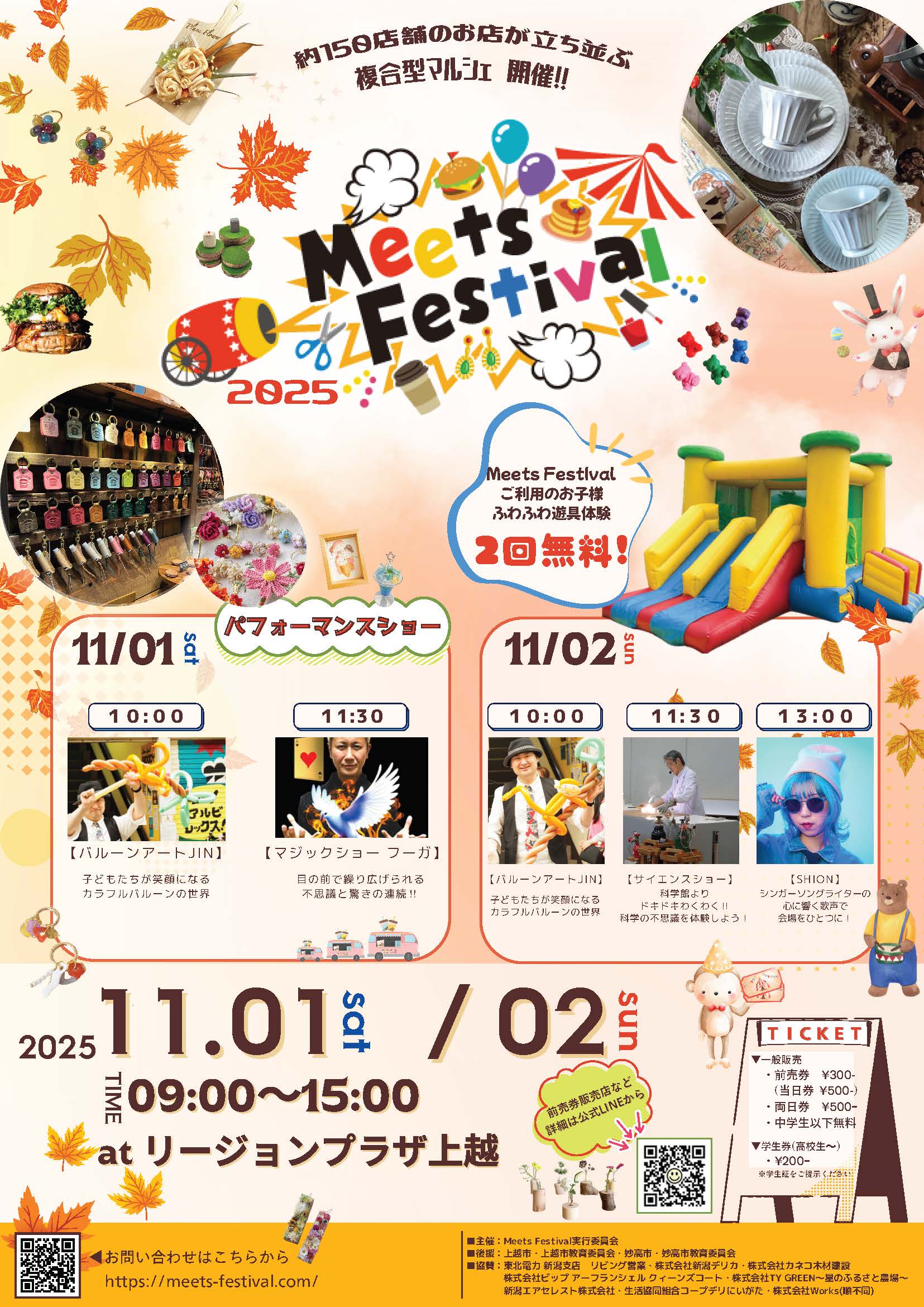 手作りアクセサリーやグルメなど、県内外から150ほどの店が集まる複合型マルシェイベント「ミーツフェスティバル」が、11月1日(土)、2日(日)にリージョンプラザ上越で開催されます。