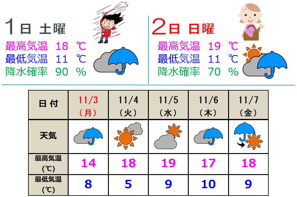 ・連休期間と後半は雨模様となりそうですが、4日(火)は貴重な秋晴れとなりそう