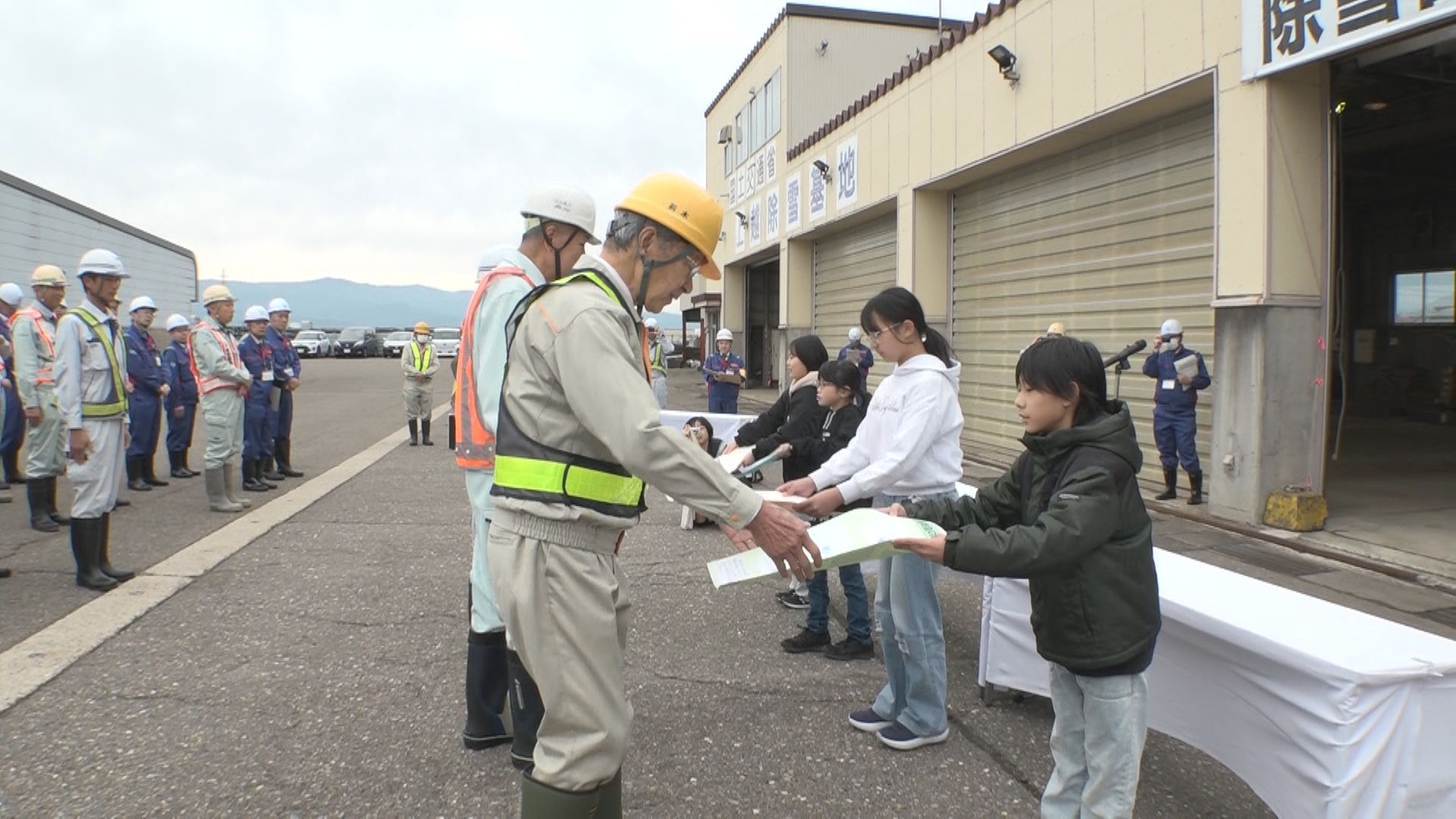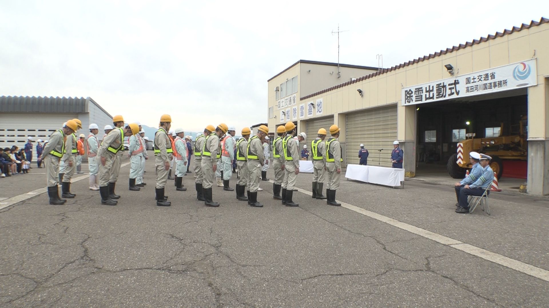 出動式には、除雪を請け負う4社の従業員や上越市立南川小学校の児童が参加しました。