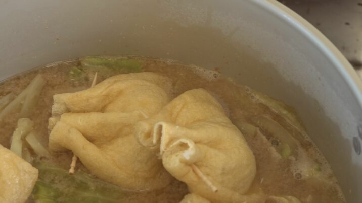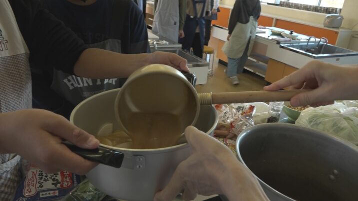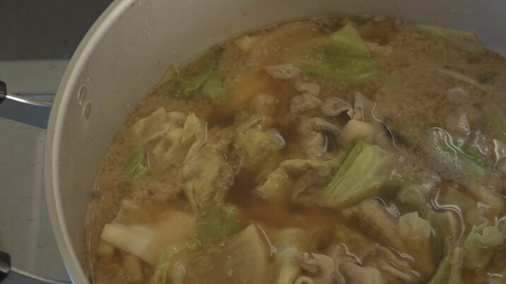 4日は、これまでに決めた上越産の酒かすと町田醤油味噌醸造場の醤油を使ったスープにダイコンやキャベツ、豚肉などを入れて煮込みました。