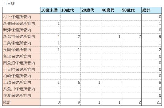 上越保健所管内の報告数は定点医療機関あたり3.75人(前の週 1.75人)、実数は15人(前の週 7人)でした。県全体の平均は定点医療機関あたり4.55人(前の週 4.29人)、実数は250人(前の週236人)でした。