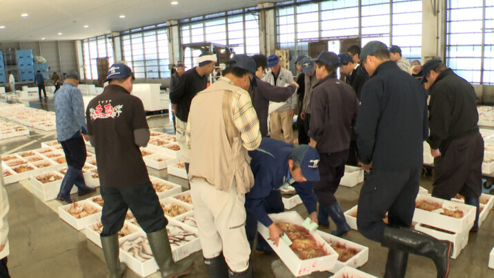 午後3時からはせりが行われ、上越地域の鮮魚店や飲食店の人などが、とれたてのカニや魚を競っていました。