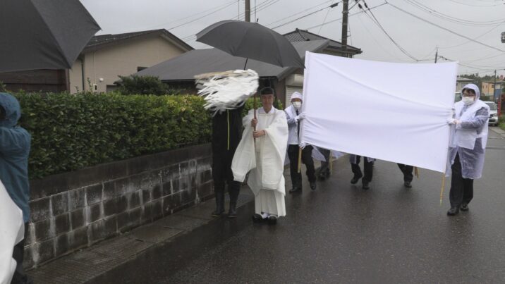 あいにくの雨模様でしたが、新しい社殿の前には住民30人ほどが出て一行を迎えました。