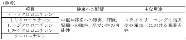 これらの有害物質は、ドライクリーニングの溶剤や金属加工の脱脂剤などに使用されるもので、中枢神経系や肝臓、腎臓への障害、発がん性の可能性があるということです。