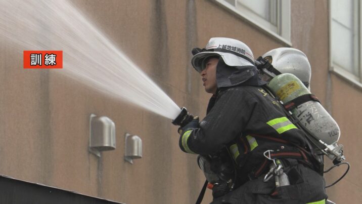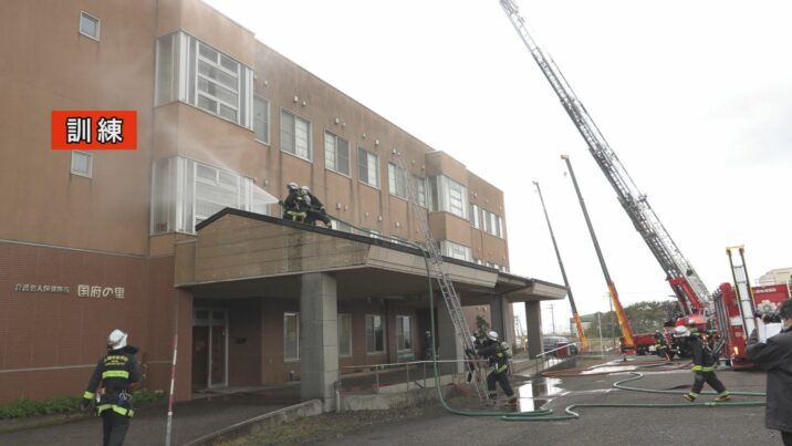 訓練は秋の全国火災予防運動にあわせて、上越消防署と介護老人保健施設「国府の里」が合同で行ないました。上越地域を震源とする震度7の地震が発生し、施設の厨房から出火した想定で消防署員や施設職員などおよそ40人が参加しました。