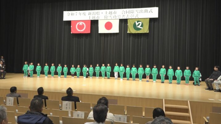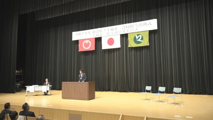 除雪出動式は県と上越市が除雪体制の連携を強化するため、3年前から合同で毎年開いています。上越市内でこの冬、除雪の対象となる道路は県道がおよそ546キロメートル、市道がおよそ1772キロメートルです。作業にあたる業者はあわせて118社で、除雪車は去年より6台多い655台で対応します。