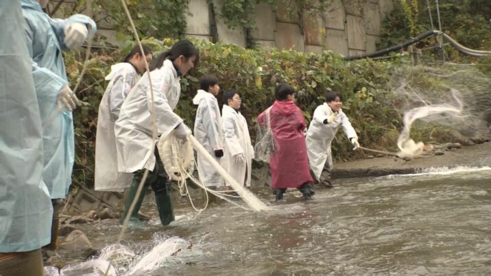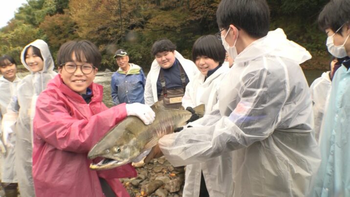 生徒は、小学校のときに受精卵を育て、ふ化した稚魚を放流。中学校では投網漁を体験するなど、サケ漁のサイクルを学んでいます。