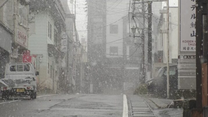 妙高市の赤倉温泉やいもり池周辺では、今朝今シーズン初めて雪が降りました。赤倉では雪が風であおられ横殴りに降る時間帯もありました。