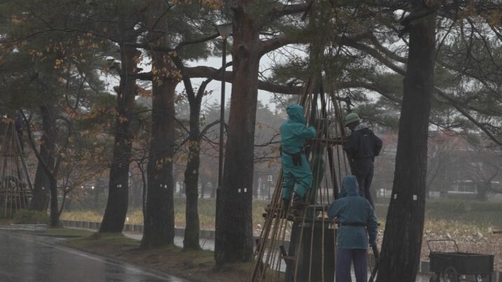 18日(火)上越地方は冬型の気圧配置となり、上越市高田では朝から雨やみぞれが降り続きました。こうしたなか、高田城址公園ではブロンズ像の冬囲いが始まりました。