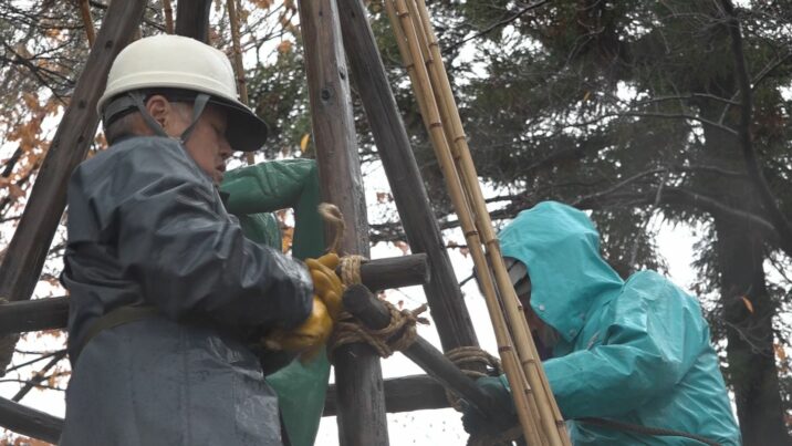 雨やみぞれが降るなか、高田城址公園では、ブロンズ像の冬囲いが18日(火)から始まりました。