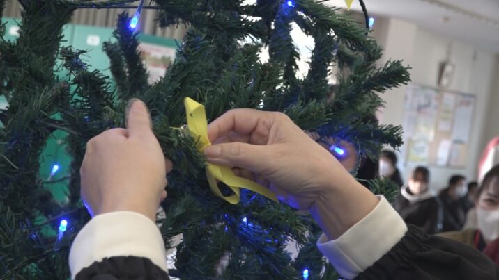初日の20日(木)は上越市高土町のつくしセンターで、点灯式が行われ、施設の利用者や職員などおよそ30人が募金をして、リボンを結びました。