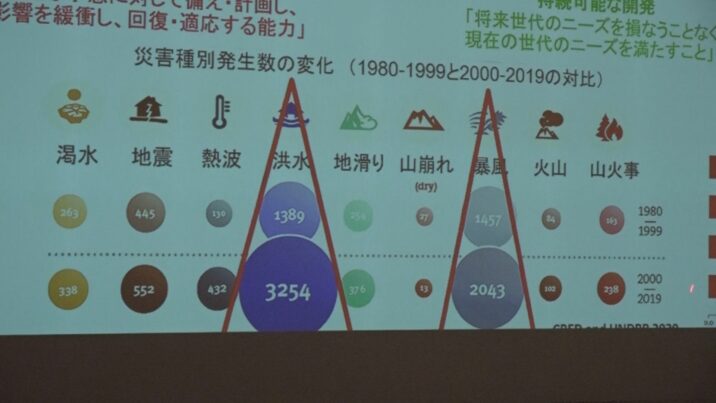 「温暖化によって、海面温度が高かったので線状降水帯が発生しやすくなっているというのが現在の科学の理解。世界で過去20年と最近の20年で見ると洪水と台風(暴風)が爆発的に増加」