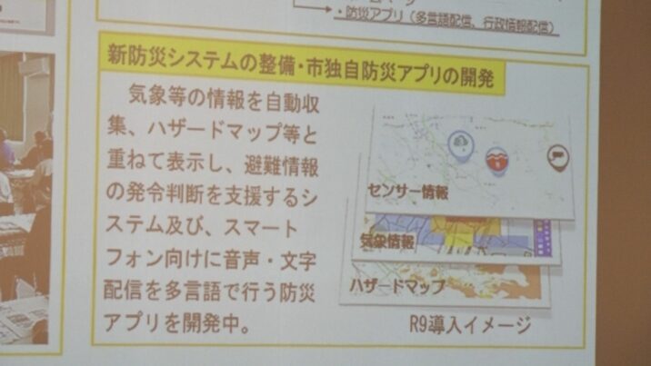 「令和9年度に一斉配信システムを導入し、情報伝達の迅速化を図る。気象、水位情報を自動収集し、ハザードマップと重ねて危険箇所を把握。防災情報発令判断支援システムや多言語対応 防災アプリ開発を進めている」