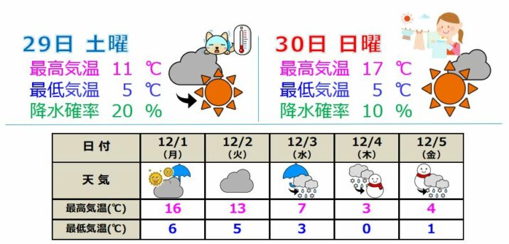 ・日差しはあっても最高気温は11度前後。朝からあまり上がらず肌寒い体感となりそう